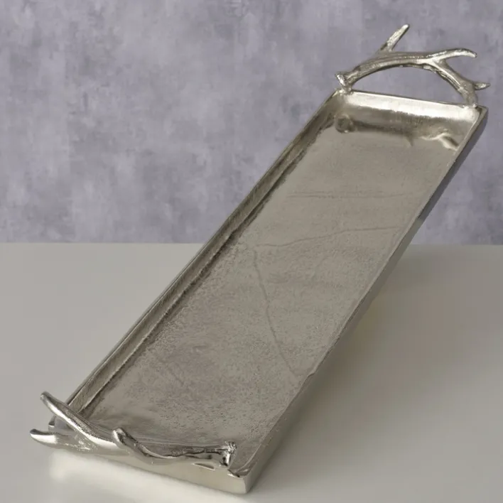 Besonders auffällig sind die dekorativen Griffe in Form von Geweihen, die dem Tablett einen einzigartigen Charakter verleihen. Das Material aus Metall sorgt für Stabilität und Langlebigkeit, während das Design sowohl funktional als auch ästhetisch ansprechend ist. Dieses Tablett ist ideal für den Einsatz in Wohn- und Essbereichen und bietet eine stilvolle Möglichkeit, Getränke oder Dekorationen zu präsentieren.