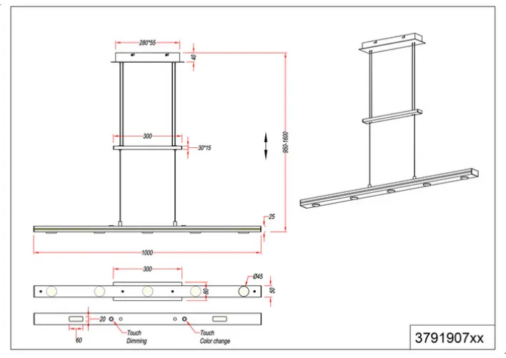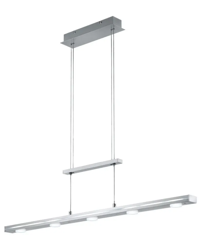 Die Pendellampe ist an zwei Seilen befestigt. Sie hat eine rechteckige Form und besteht aus robustem Metall. Außerdem lässt sich die Lampe in der Höhe verstellen und ist mit fünf kreisrunden Flammen ausgestattet. Die notwendigen LED-Leuchtmittel befinden sich bereits in der Lampe und bietet gemeinsam eine Lichtleistung von 2660 lm und eine Farbtemperatur von 5000 K. Die Brenndauer liegt bei ca. 30.000 Stunden. Die Lichtfarbe lässt sich individuell einstellen, sodass unterschiedliche Lichtstimmungen erzeugt werden können.