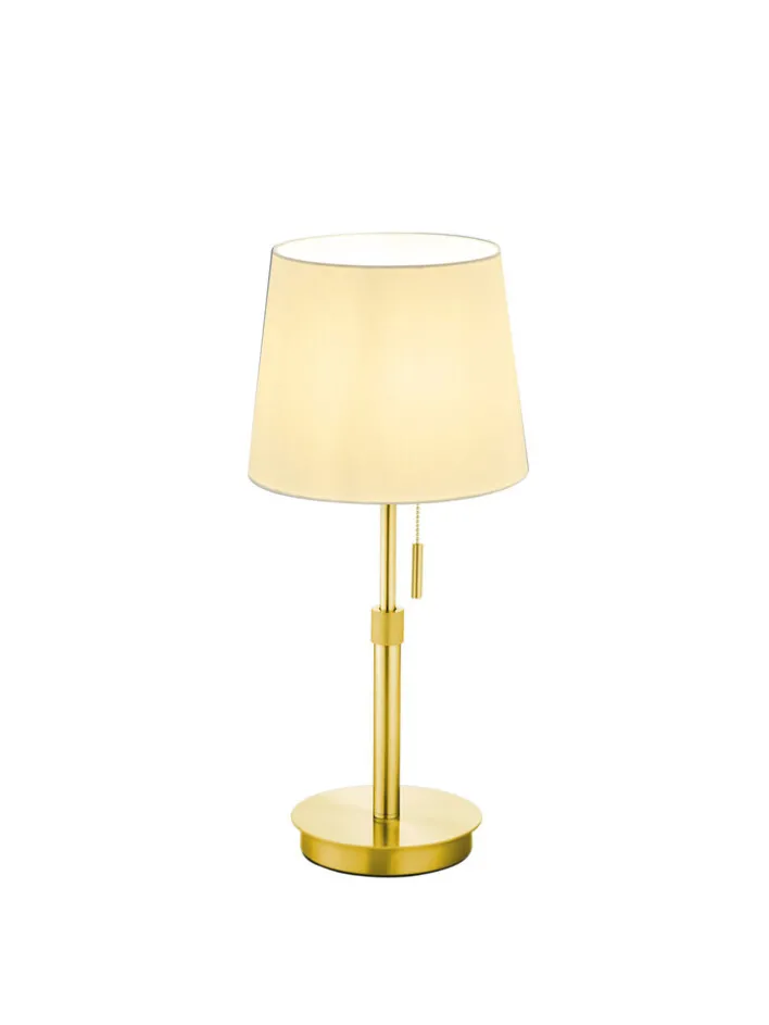 Die messingfarbige TRIO Retrofit Tischlampe LYON ist aus Metall mit einer matten Oberfläche gefertigt. Sie trägt einen textilen weißen Schirm mit einem Durchmesser von 25,5 cm.