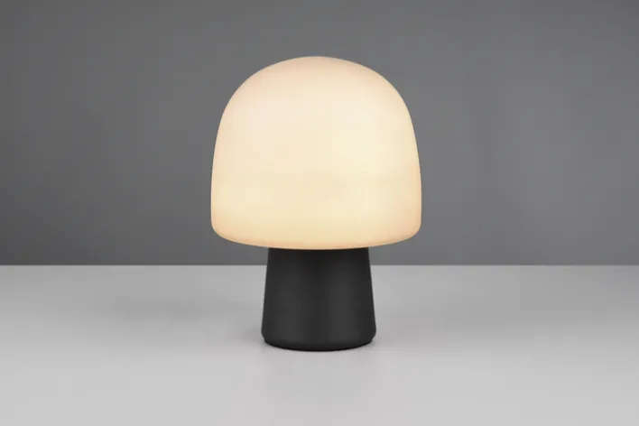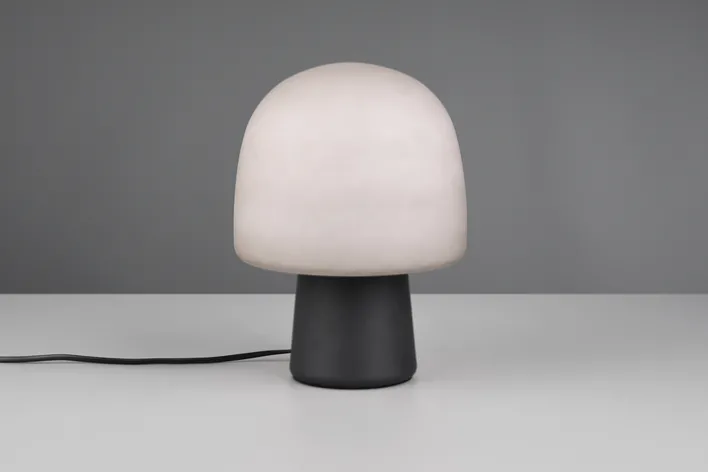 Wer eine Tischlampe mit besonderem Design und erstklassiger Qualität sucht, findet mit dem 27 cm hohem, schwarzem Retrofit-Model STEEN von TRIO aus Metall und Glas genau das Passende. Schirm und Korpus ergeben ein pilzförmiges Design, das an die 70er Jahre erinnert, aber aufgrund der Material- sowie Farbkombination sehr modern und schick wirkt.
