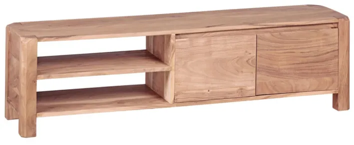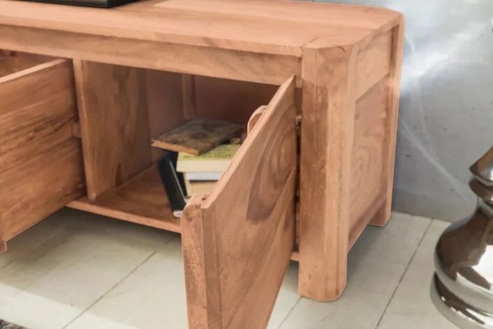 Das TV-Lowboard ist aus massiver Akazie gefertigt. Das verwendete Holz ist glatt geschliffen und aufwendig lackiert. Die Beschläge des TV-Lowboards sind aus Metall hergestellt.
