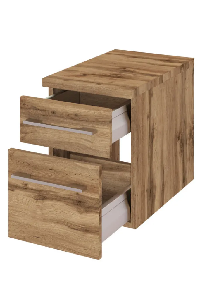 Der im Sinne einer Modulausstattung bestellbare Unterschrank im Wotan Eiche Design gehört zur DAVOS Kollektion und ist 30 x 41 cm groß. Er ist für die hängende Montage vorgesehen und verfügt über zwei große Schubladen, die der Gewinnung weiteren Stauraums dienen. Sie lassen sich mit filigranen Metallgriffen öffnen. Die Soft-Close-Technologie schließt sie sanft und fast geräuschlos. Beim Korpus handelt es sich um Holznachbildung – pflegeleichte Spanplatte (MDF).
