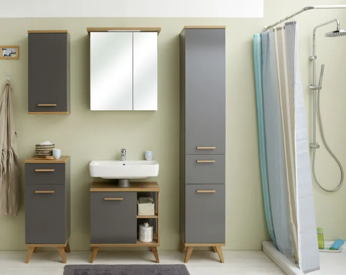 Der Bad-Unterschrank aus der Serie GLOW überzeugt durch sein modernes Design und seine funktionale Ausstattung. Mit einer Breite von 35,5 cm, einer Höhe von 89,5 cm und einer Tiefe von 33 cm bietet er ausreichend Stauraum für diverse Badutensilien. Der Schrank ist in einem eleganten Quarzgrau gehalten, das perfekt mit der Riviera Eiche Dekorfarbe harmoniert. Diese Kombination verleiht dem Möbelstück eine zeitlose und stilvolle Optik, die sich in jedes Badezimmerambiente einfügt.