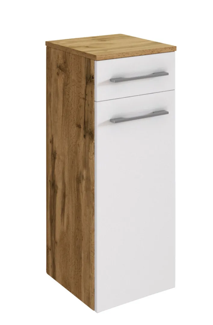 Der Unterschrank LIVORNO in der Farbkombination Wotan Eiche/ Weiß Matt benötigt eine Stellfläche von 30 x 64 cm. Mit seinem modernen Look schenkt er dem Badezimmer ein einladendes Ambiente mit natürlichem Flair.