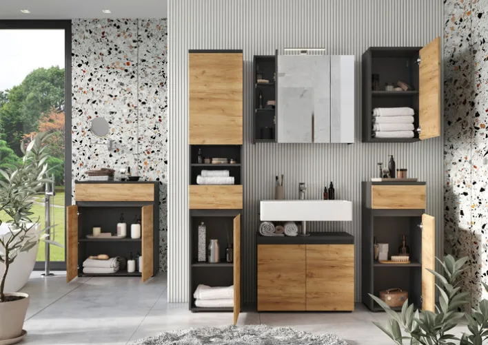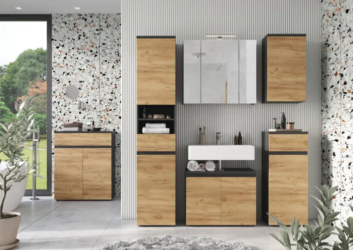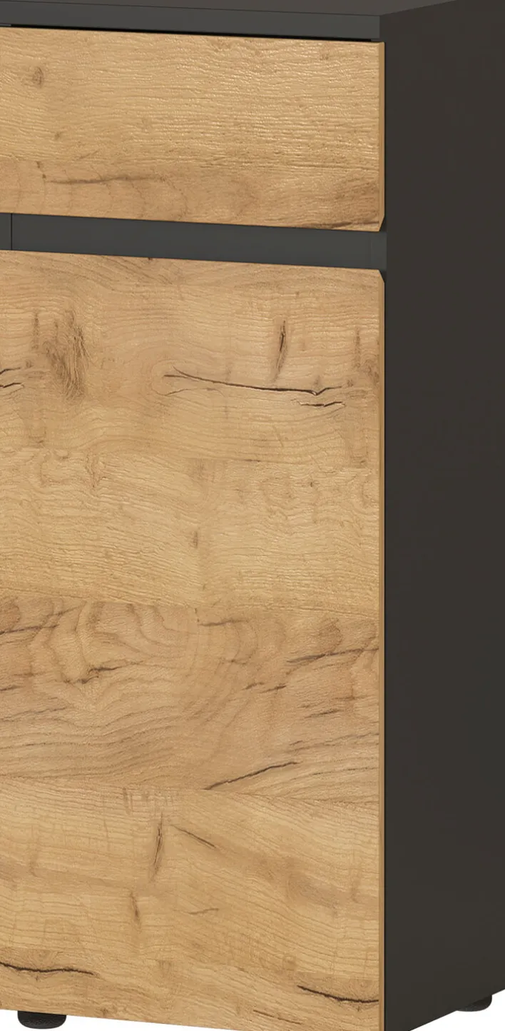 Der Schrank aus der Serie MAYOR besticht durch sein modernes und zugleich natürliches Design. Die Fronten in Navarra Eiche Dekor verleihen dem Möbelstück eine warme und einladende Ausstrahlung, während die graphitfarbenen Akzente einen eleganten Kontrast bieten. Mit einer Breite von 39 cm, einer Höhe von 95 cm und einer Tiefe von 34 cm fügt sich der Schrank nahtlos in verschiedene Wohnräume ein und bietet dabei praktische Aufbewahrungsmöglichkeiten.