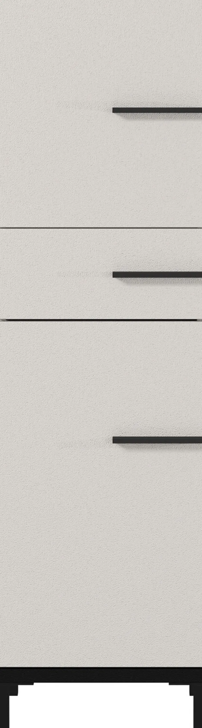 Der hohe Unterschrank begeistert mit viel Stauraum. Die beiden Türen sind in der Mitte von einer Schublade getrennt. Sowohl die Drehtüren als auch der Schubkasten haben an der rechten Seite längliche schwarze Griffe. Der Korpus und die Fronten bestehen aus Spanplatten und Melaminharz. Daher ist das Modell leicht zu reinigen. Dieser Unterschrank passt sowohl ins Badezimmer als auch in ein großes Gäste-WC.
