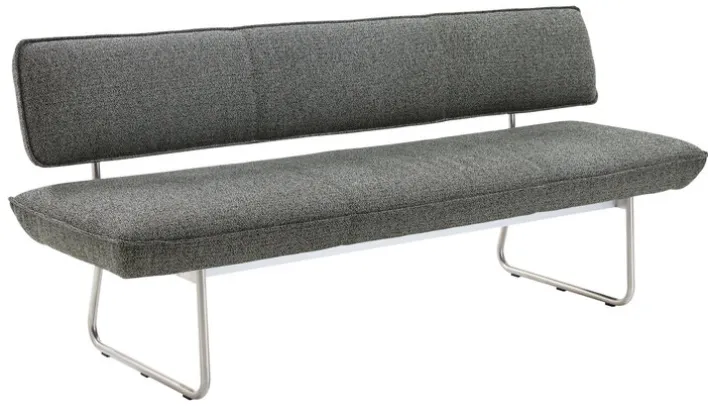 Das stabile Untergestell der Esszimmerbank besteht aus rostfreiem Edelstahl. Die sichtbaren Oberflächen sind poliert. Die durchgehende Sitzfläche und die Rückenlehne sind mit atmungsaktivem Kaltschaum gepolstert und aufwendig mit Textil bezogen. Zum Schutz von empfindlichen Bodenbelägen ist das Kufengestell mit Kunststofffüßen ausgestattet.