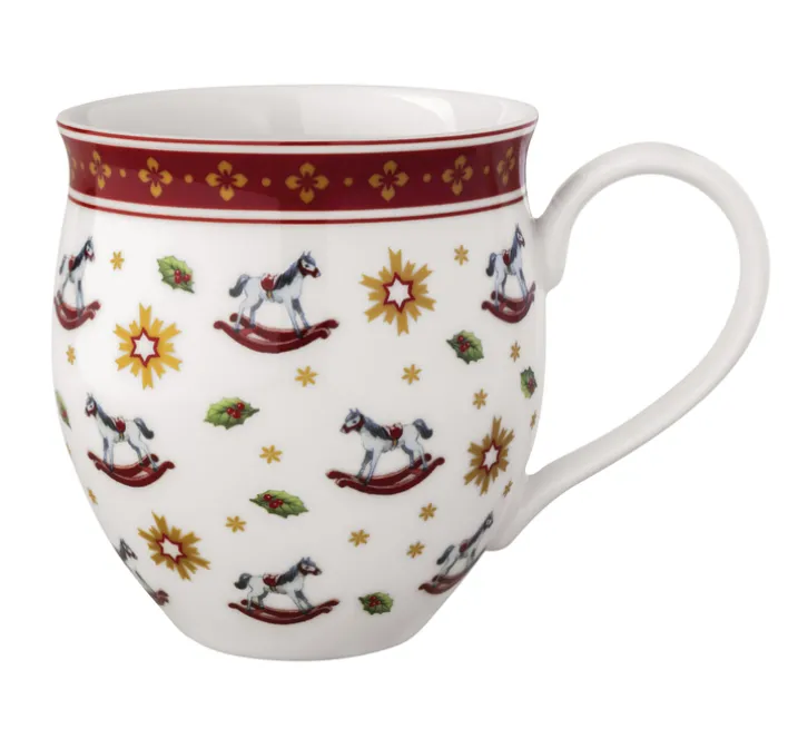 Das Becher-Set aus der Serie TOY’S DELIGHT von Villeroy & Boch besteht aus vier bauchigen Bechern mit einer Höhe von 10,1 cm und einem Fassungsvermögen von jeweils 390 ml. Die Becher sind aus hochwertigem Bone China gefertigt, was ihnen eine feine und zugleich robuste Beschaffenheit verleiht. Die Hauptfarbe ist Weiß, ergänzt durch ein mehrfarbiges Dekor, das auf jedem Becher unterschiedliche weihnachtliche Motive wie Spielzeuglokomotiven, Nussknacker, Schaukelpferde und Figuren zeigt. Ein durchgehender roter Rand mit goldfarbenen Ziermustern verleiht den Bechern eine festliche Optik. Das Set ist für vier Personen geeignet und bietet sich besonders für den Einsatz in der Küche an. Die Oberfläche ist glatt, das Design wirkt detailreich und traditionell mit klaren, kontrastreichen Farben.