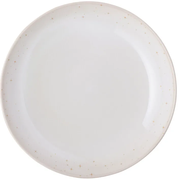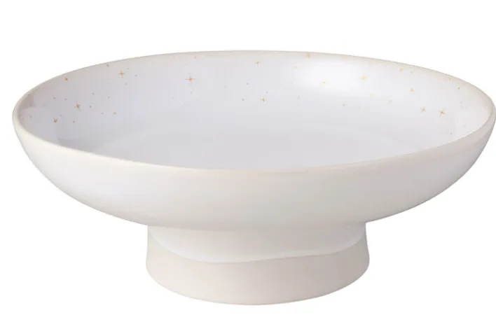 Die runde Schale besteht aus edlem Porzellan in den Farben beige und weiß. Im Inneren ist sie mit einem goldfarbigen Muster aus Sternen und Schneeflocken verziert, das ihr eine besonders grazile Ausstrahlung verleiht. Sie brilliert in Küche, Wohn- und Esszimmer als Schale für Obst, Kekse und Nüsse oder einfach als attraktives Deko-Objekt. Ihr hochwertiges Material ist für die Microwelle geeignet und wird mit der Hand abgewaschen.