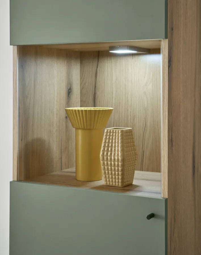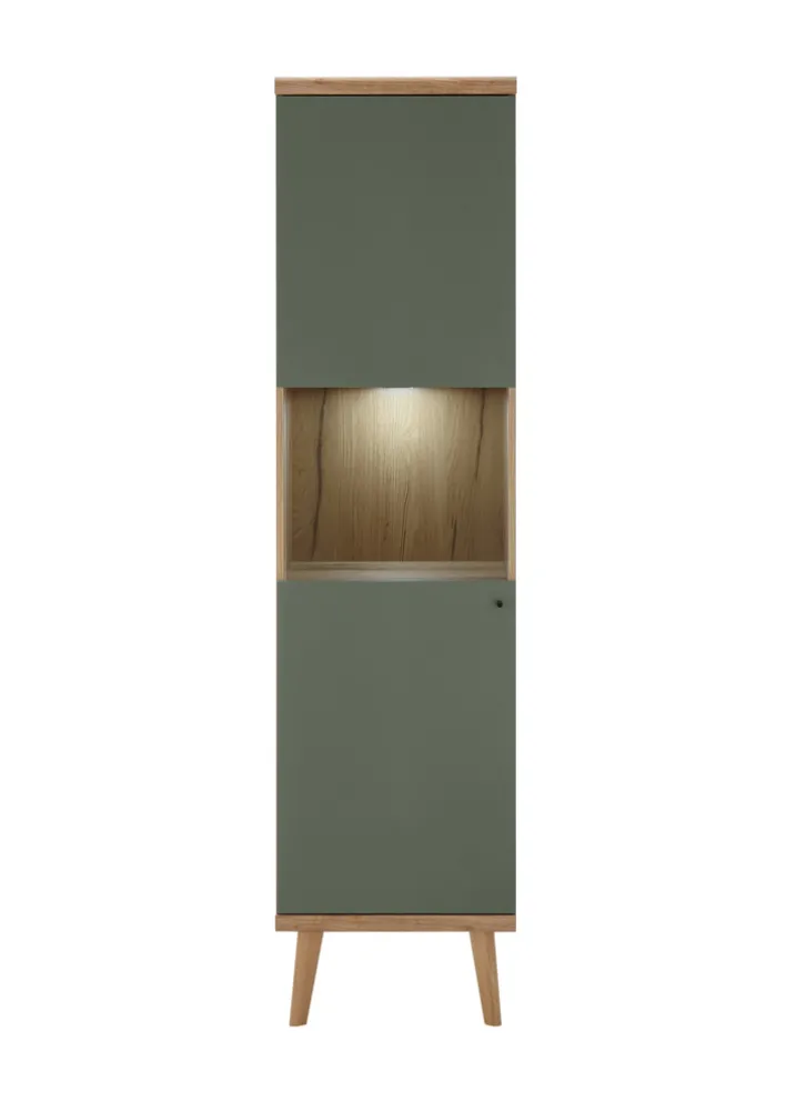 Die salbeifarbige und braune Vitrine ALVA hat eine Größe von 50 x 197 cm. Das stilvolle Möbelstück bietet Platz für Bücher, Dekoartikel und mehr.