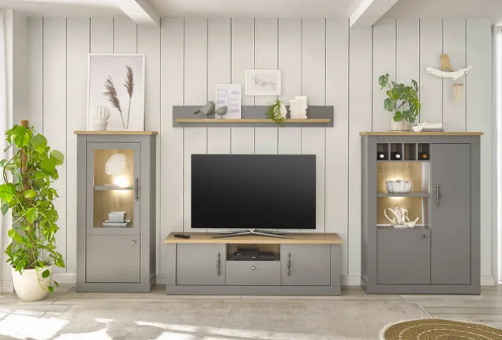 Hergestellt aus hochwertiger Holznachbildung bietet die 37 cm tiefe Vitrine CHAMBORD eine gute Stabilität. Das moderne Hellgrau kombiniert mit Applikationen in Artisan-Oak-Dekor verleiht dem Möbelstück einen modernen Look mit rustikalem Charme. Silberfarbige Metallgriffe runden das Design perfekt ab. Mit ihrem extravaganten Aussehen verleiht die Vitrine dem Wohnzimmer im Nu eine gemütliche Atmosphäre. Neben der Optik überzeugt sie mit viel Stauraum hinter zwei Drehtüren, einer davon mit Glaseinsatz.