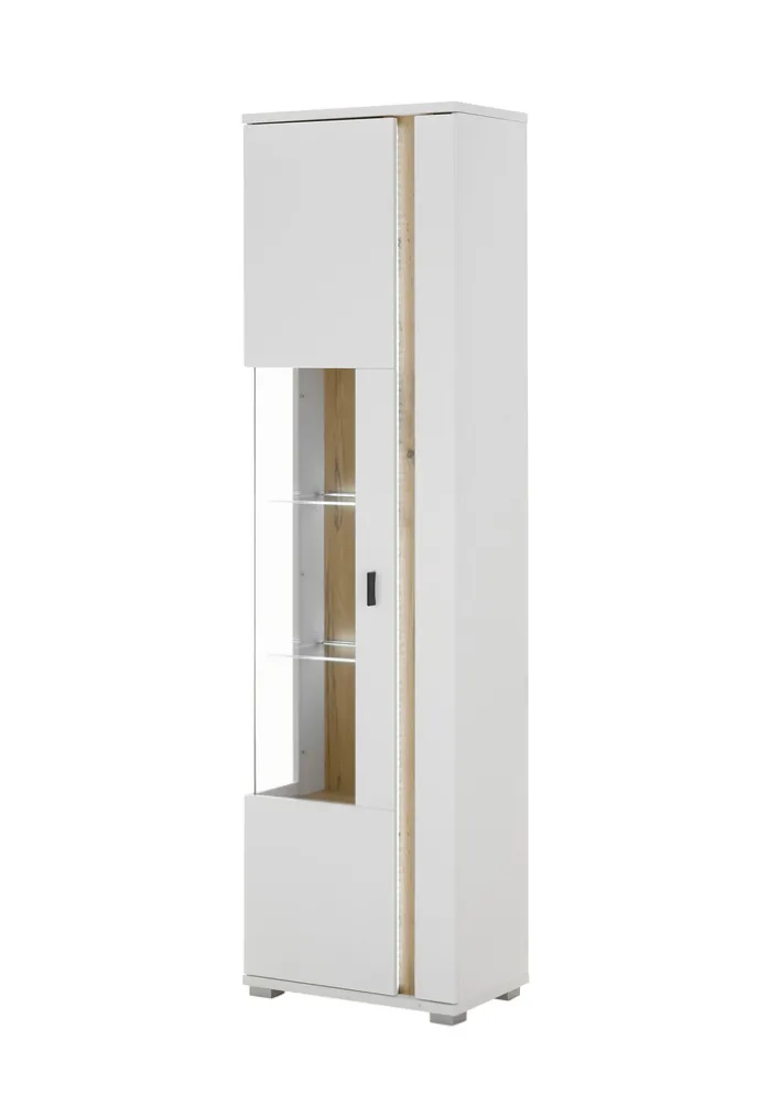 Die Vitrine aus der Serie LONG ISLAND vereint modernes Design mit klassischer Eleganz. Mit einer Breite von 55 cm, einer Höhe von 200 cm und einer Tiefe von 35 cm bietet sie ausreichend Stauraum und passt sich harmonisch in verschiedene Wohnräume ein. Die Hauptfarbe ist Weiß, ergänzt durch Akzente in Wotan Eiche, die dem Möbelstück eine warme und natürliche Note verleihen. Die Vitrine verfügt über eine Drehtür und fünf Einlegeböden, die viel Platz für Dekorationen oder Geschirr bieten.