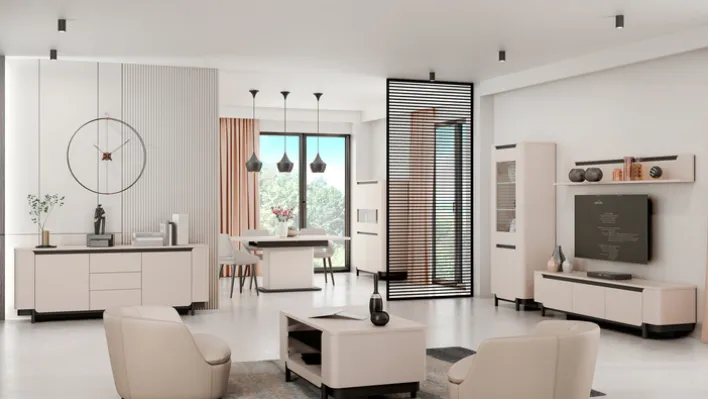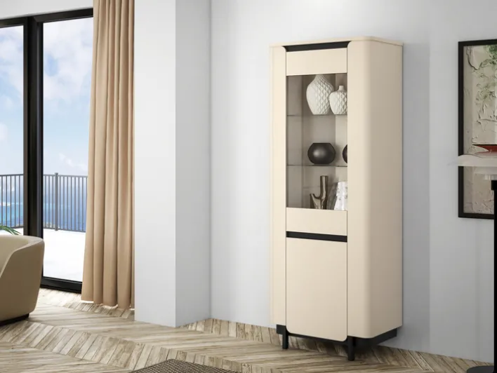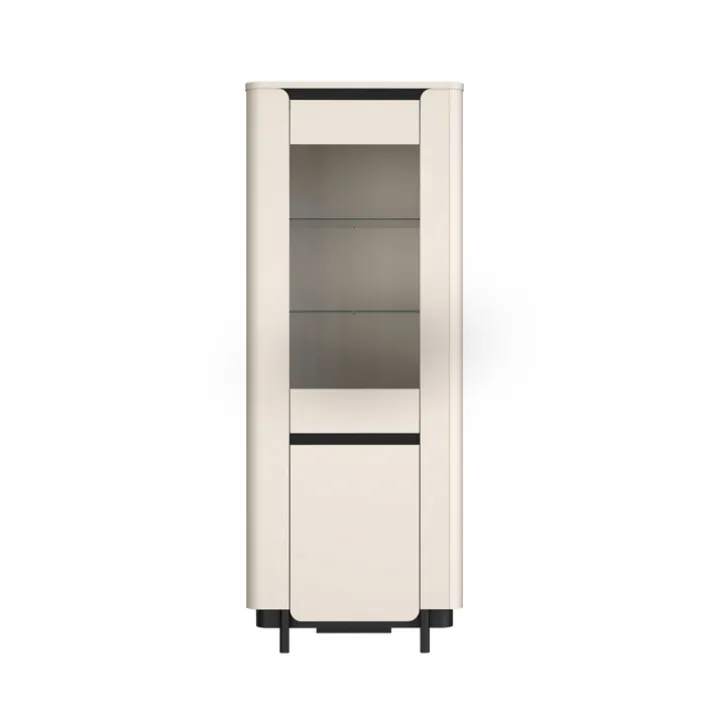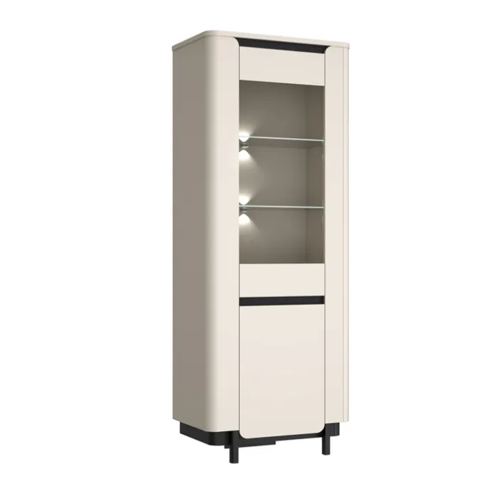 Die Vitrine VODOL mit den Maßen 75,6 x 196,3 cm setzt in ihrem eleganten Cremeton und den schwarzen Applikationen stilvolle Akzente in jedem Wohnraum. Die Glastür im oberen Drittel besteht aus hochwertigem Sicherheitsglas, hinter der sich zwei beleuchtete Glaseinlegeböden befinden. Der untere Bereich wird durch eine Drehtür verschlossen und bietet mit einem integrierten Einlegeboden zusätzlichen Stauraum.
