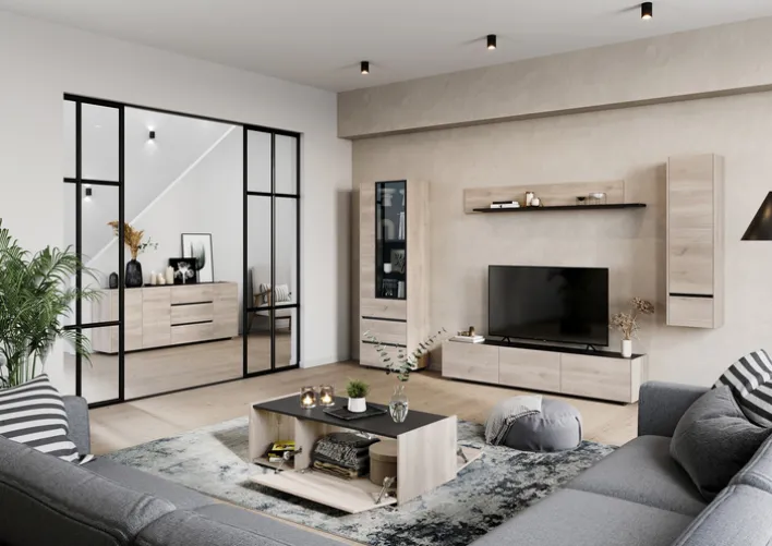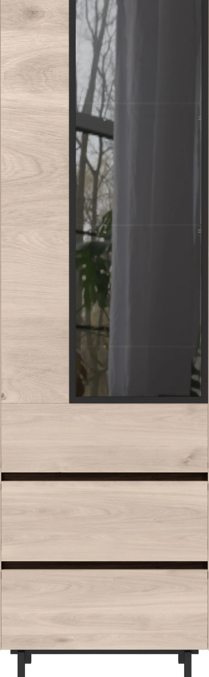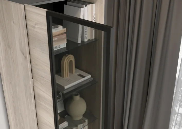 Der 1-türige Vitrinenschrank EMMA hat die Maße 84 x 206 cm und passt durch sein griffloses Design in modern eingerichtete Wohnzimmer. Durch Fronten im Dekor Castello-Eiche in der Farbe Beige und einer Glastür in Schwarz ist der Vitrinenschrank ein Blickfang und ermöglicht zahlreiche Kombinationsmöglichkeiten. Zwei Schubkästen mit Selbsteinzug bieten zusätzlichen Stauraum für Kleinteile. Deko-Accessoires oder Bilder finden auf drei Glas-Einlegeböden ihren Platz. Der Vitrinenschrank komplettiert die Einrichtung und schafft eine wohnliche Atmosphäre.