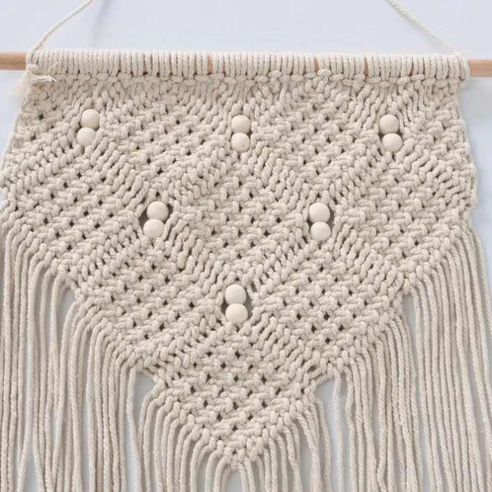 An einem Holzstab ist ein schickes Gewebe in Makramee-Knüpftechnik zu sehen. Daran hängen dicht an dicht sehr lange Fransen, die jeweils in einem Knoten und alle auf derselben Höhe enden. Diese schicke Deko braucht einen besonderen Wandplatz. Zum einen muss er in der Höhe frei sein, aber auch in der Breite muss etwas Raum vorhanden sein. So eignet sich die Deko MAKRAMEE zum Aufhängen im Schlaf- oder Wohnzimmer, hinter dem Esstisch oder auch im Flur.