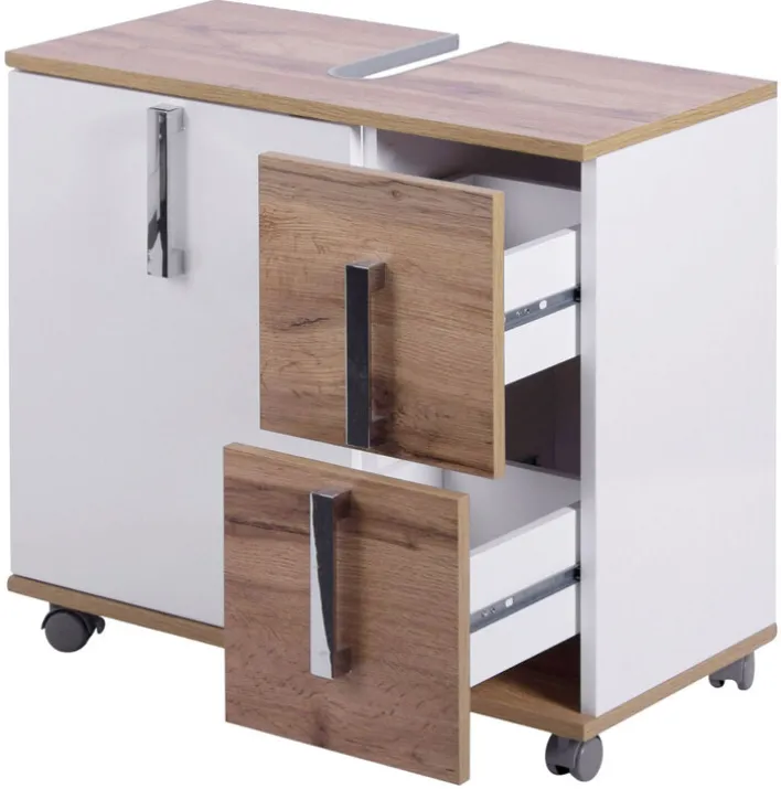Waschbeckenunterschrank LUCA ist 65 x 60 cm groß und punktet mit einem modernen Design in Weiß / Eiche Landhaus. Die Verarbeitung in Holznachbildung / Melamin ist sehr hochwertig, pflegeleicht und robust.