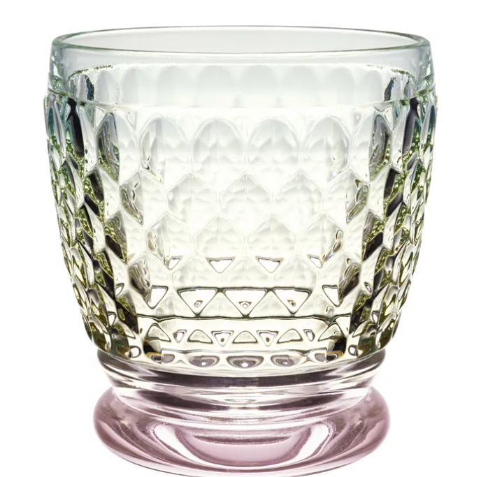 Die mehrfarbige Gestaltung des Glases verleiht ihm eine besondere Ästhetik. Die Oberfläche ist mit einem facettenreichen Muster versehen, das dem Glas eine interessante Textur und einen ansprechenden visuellen Effekt verleiht. Der stabile Fuß in einem zarten Rosaton sorgt für einen sicheren Stand und rundet das Design harmonisch ab. Dieses Trinkglas ist nicht nur funktional, sondern auch ein stilvolles Accessoire für jeden gedeckten Tisch.