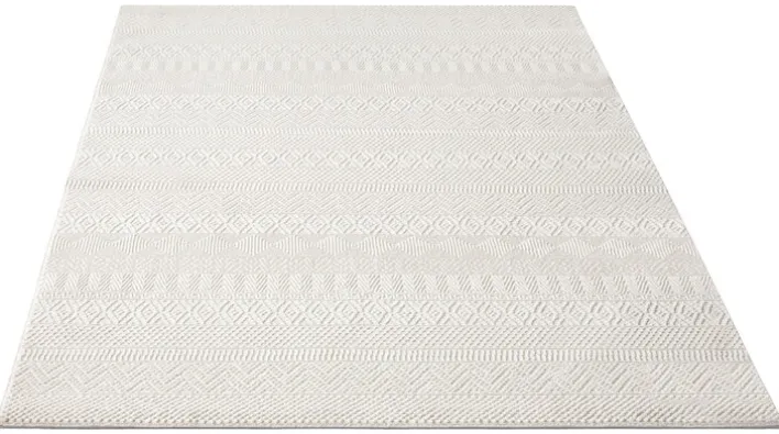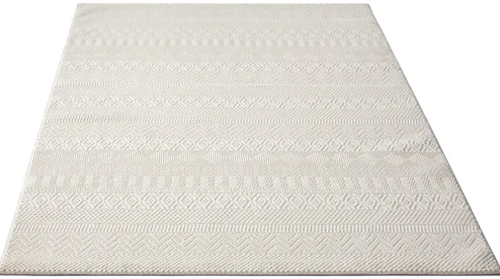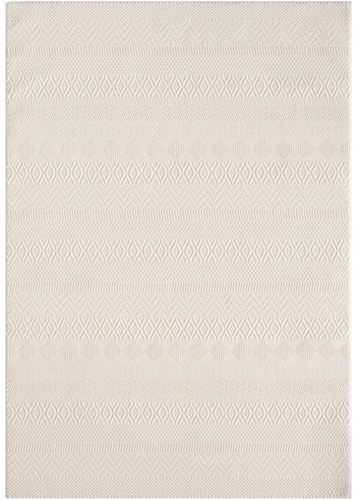 Der cremefarbige Webteppich SASA hat die Maße 160 x 230 cm und eignet sich für den modernen Wohnbereich. Durch das grafische Muster ist der farbechte Teppich ein Blickfang für Wohn- und Esszimmer. Auch für das Schlafzimmer ist er ideal und fügt sich harmonisch in bereits bestehende Einrichtungen ein. Der Webteppich hat eine Gesamtflorhöhe von etwa 17 Millimeter und vermittelt beim Barfuß gehen ein angenehmes Gefühl.