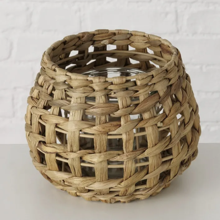 Das Geflecht aus Naturmaterialien sorgt für eine ansprechende Optik und verleiht jedem Raum eine natürliche Note. Das Windlicht wird ohne Kerzen geliefert, sodass es individuell nach den eigenen Vorlieben gestaltet werden kann. Es eignet sich ideal als dekoratives Element für Wohnräume oder als stimmungsvolle Beleuchtung auf dem Balkon oder der Terrasse.