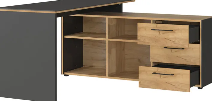 Der Schreibtisch verfügt über drei geräumige Schubkästen mit Selbsteinzug, die zusätzlichen Stauraum bieten. Das Wangengestell sorgt für Stabilität und eine maximale Belastbarkeit von 60 kg. Die integrierten offenen Fächer bieten zusätzlichen Platz für Bücher oder Dekorationsgegenstände. Dieser Winkelschreibtisch ist die ideale Lösung für ein organisiertes und stilvolles Arbeitsumfeld.