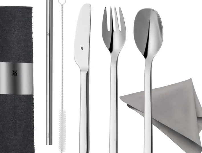 Unterwegs bestens ausgestattet sind Sie mit diesem To-Go Besteckset aus dem Hause WMF. Neben einer Gabel, einem Messer und einem Löffel beinhaltet das Ensemble aus rostfreiem Cromargan einen Strohhalm mit passender Reinigungsbürste. Alle Teile der Serie finden in dem eleganten Etui in grauer Filzoptik Platz. Einzelne Einstecktaschen halten das Besteck an Ort und Stelle und verhindern störende Klappergeräusche.