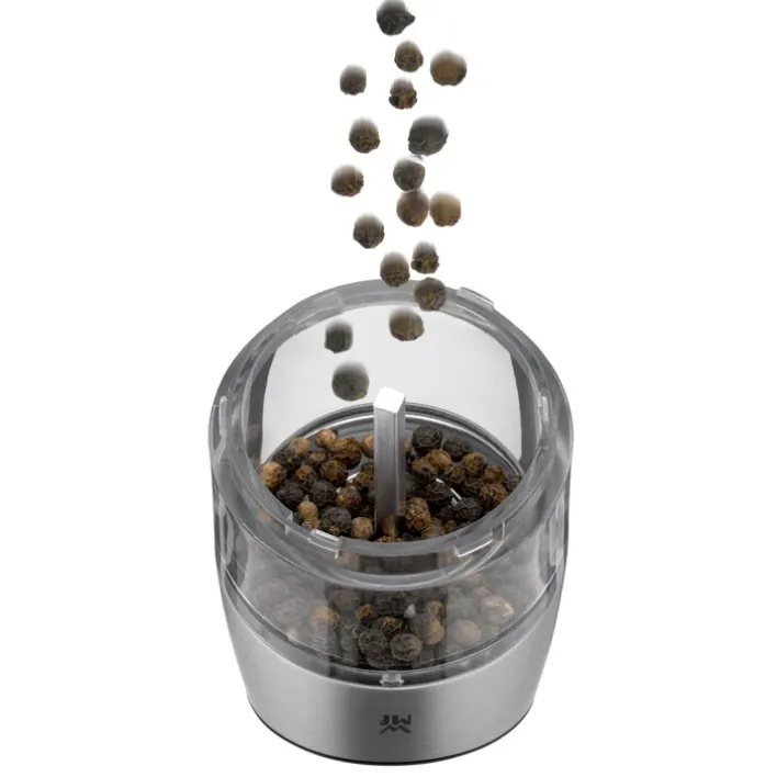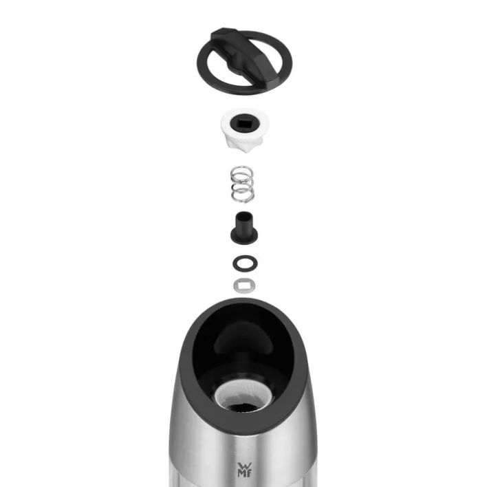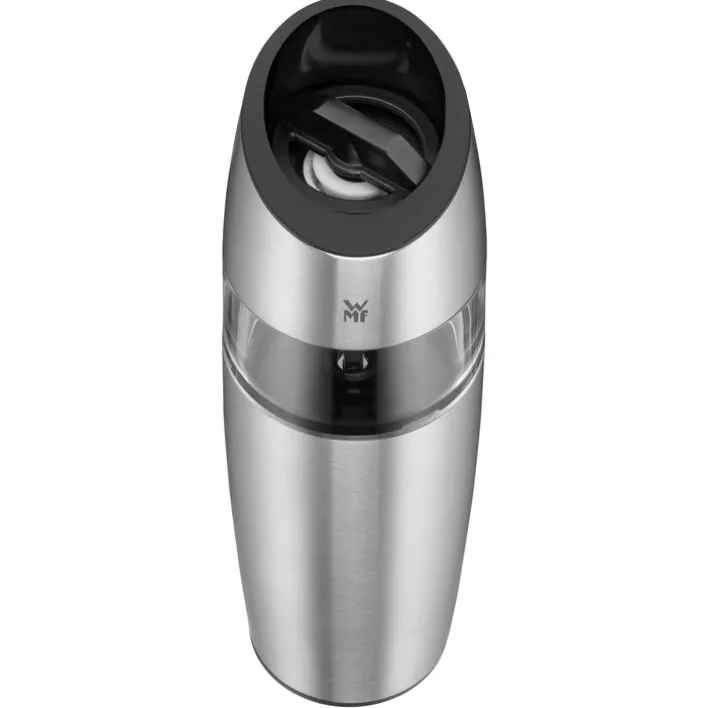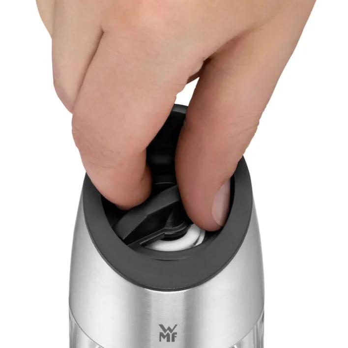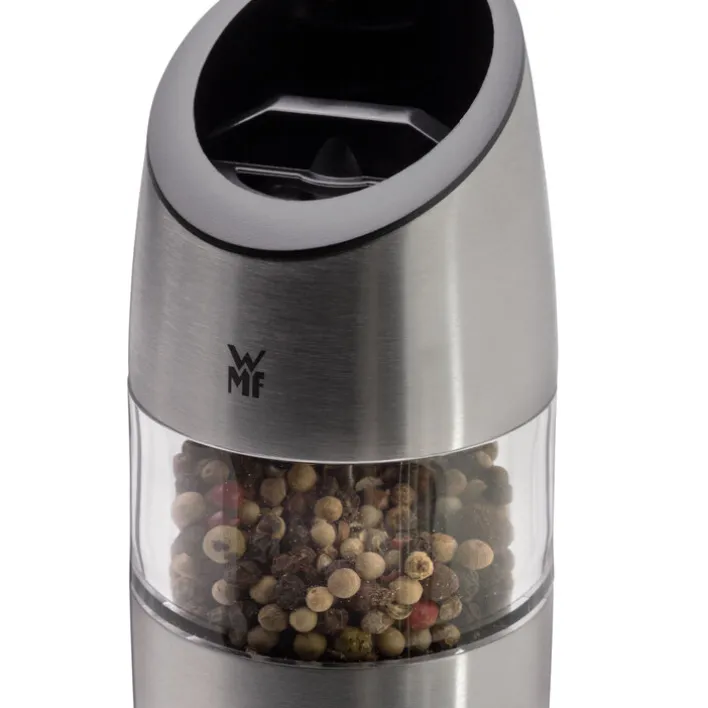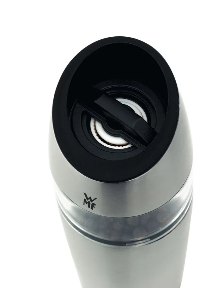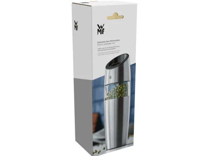 Die elektrische Salz- und Pfeffermühle ist silberfarbig designt und ein Modell des Labels WMF, welches für seine exklusiven Küchenutensilien bekannt ist. Bei der Salz- und Pfeffermühle handelt es sich um ein Exemplar mit einem hochwertigen und leistungsstarken Mahlwerk aus Keramik. Dieses arbeitet sehr effektiv und zerkleinert Pfefferkörner bzw. Salz in Windeseile.