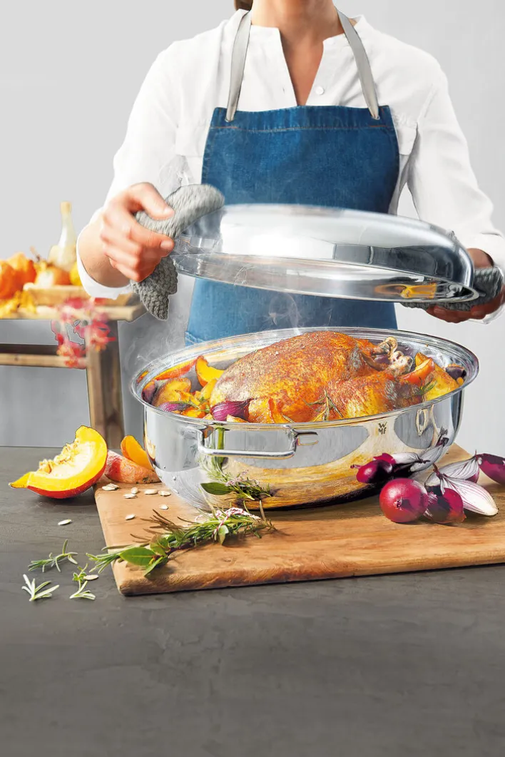 Mit einer Länge von 41 cm, einer Breite von 28 cm und einer Höhe von 18,5 cm ist der oval geformte Extrabräter ideal für das Anbraten und Schmoren großer Fleischportionen, wie einem Rinderbraten oder einer Weihnachtsgans geeignet. Der Metalldeckel lässt sich auch als praktische Edelstahl-Pfanne oder als backofenfeste Auflaufform verwenden, sodass Sie mit dem Extrabräter von WMF ein multifunktionales Kochgeschirr erhalten. Der rostfreie Cromargan Edelstahl 18/10 ist geschmacksneutral und säurefest und kann leicht in der Spülmaschine gereinigt werden.