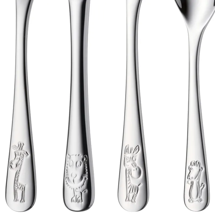 Das aus Edelstahl und Porzellan hergestellte 6-teilige SAFARI WMF Kindergeschirr-Set wird vom Hersteller für Kinder ab drei Jahren empfohlen und enthält einen Teller, eine Schale, einen kleinen Kinderlöffel, ein Kindermesser, Kindergabel und einen größeren Kinderlöffel. Alle Einzelteile besitzen eingearbeitete Gravuren oder schöne farbenfrohe Kunstwerke – und sind auch als Geschenk sehr gut geeignet.