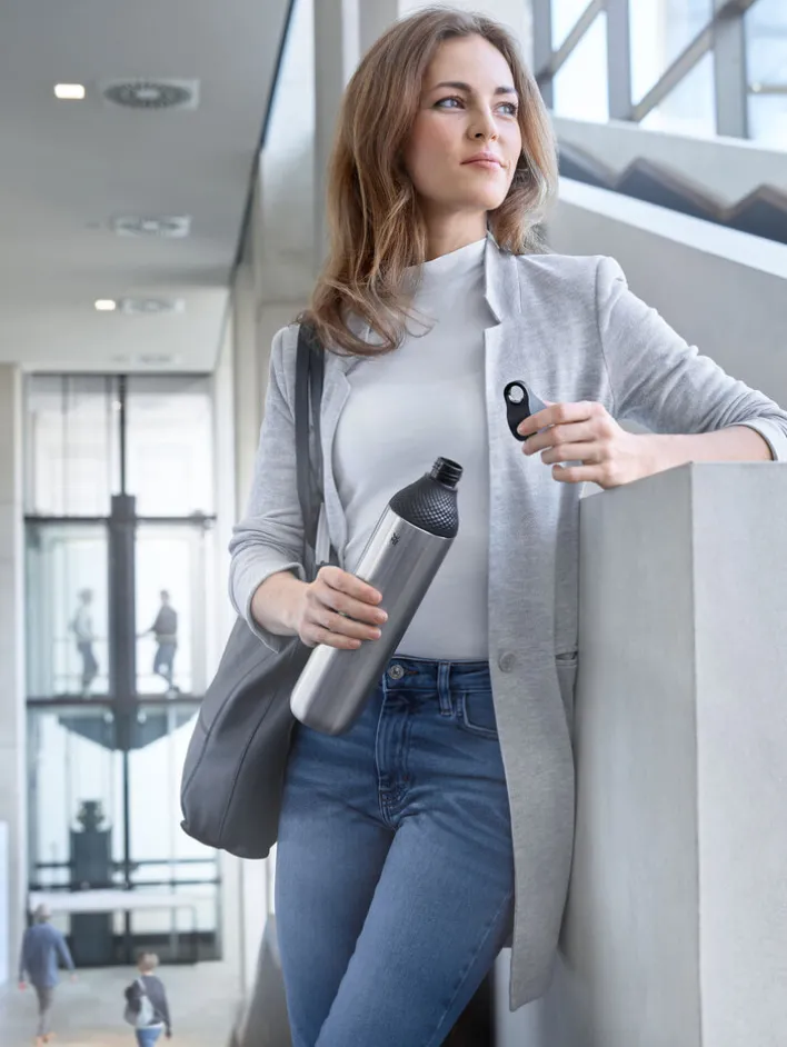 Die WMF Trinkflasche WATERKANT ISO hat ein Fassungsvermögen von 750 ml. Sie besteht aus silberfarbigem Cromargan Edelstahl 18/10 und schwarzem Silikon.