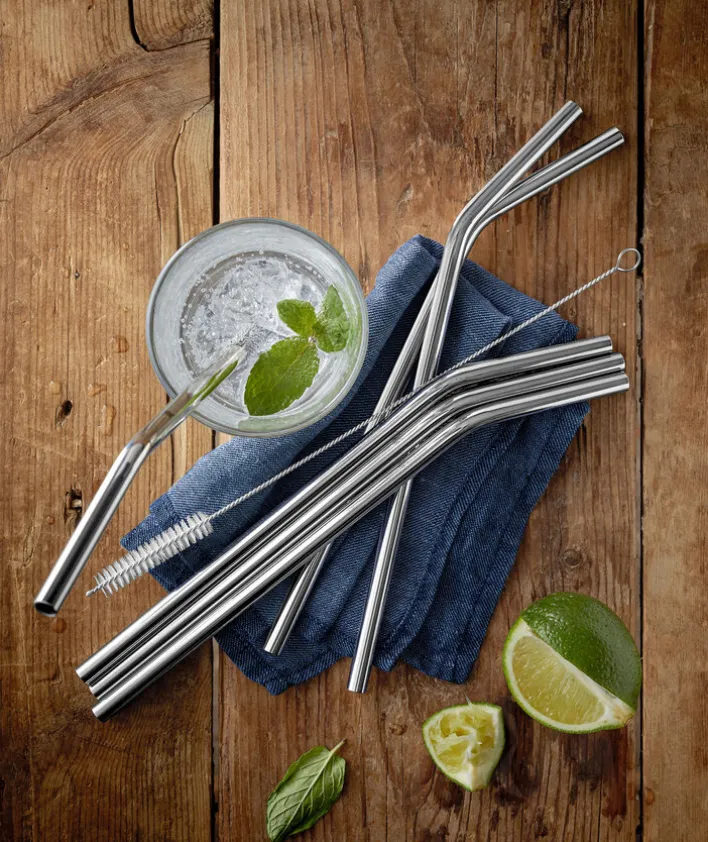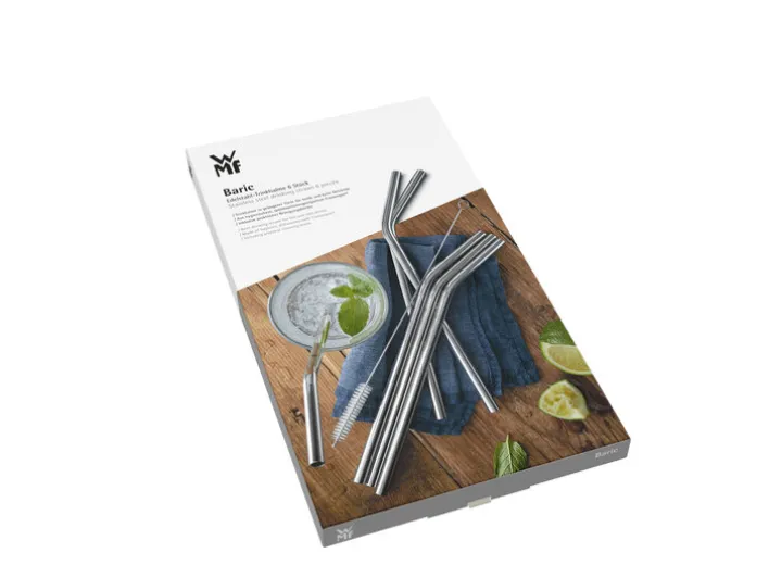 Mit dem 7-teiligen WMF gebogene Trinkhalme Set BARIC aus Edelstahl lassen sich Cocktails und alkoholfreie Getränke jetzt auch umweltfreundlich genießen.