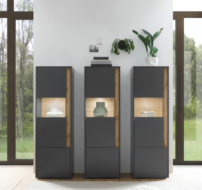 Die Wohnwand aus der Serie CITY vereint modernes Design mit skandinavischem Stil und bietet eine elegante Lösung für Ihr Wohnzimmer. Die Vitrine besteht aus drei Teilen, die jeweils 50 cm breit, 155 cm hoch und 40 cm tief sind. Die Hauptfarbe ist ein stilvolles Anthrazit, kombiniert mit einem warmen Wotan-Eiche-Dekor, das den modernen Look unterstreicht. Die Holznachbildung sorgt für eine robuste und pflegeleichte Oberfläche, die sich harmonisch in verschiedene Einrichtungsstile einfügt.