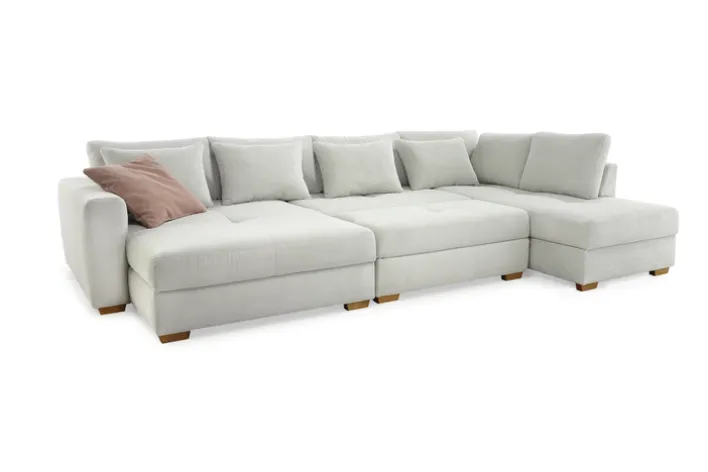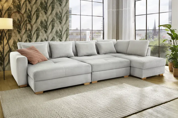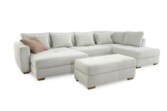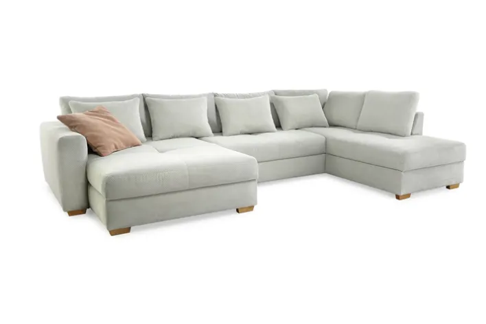 Für die nötige Gemütlichkeit sorgen bei der EVEN Wohnlandschaft unter anderem zehn Rückenkissen sowie die zwei verlängerten Ottomanen – wovon eine etwas schmaler als die andere geformt ist. Die Standfüße aus hellem, warmem Holz sorgen für eine optische Note, die typisch für den skandinavischen Stil ist. Der Waffelcordbezug besitzt eine lebhafte Struktur und ist zudem ausgesprochen robust.