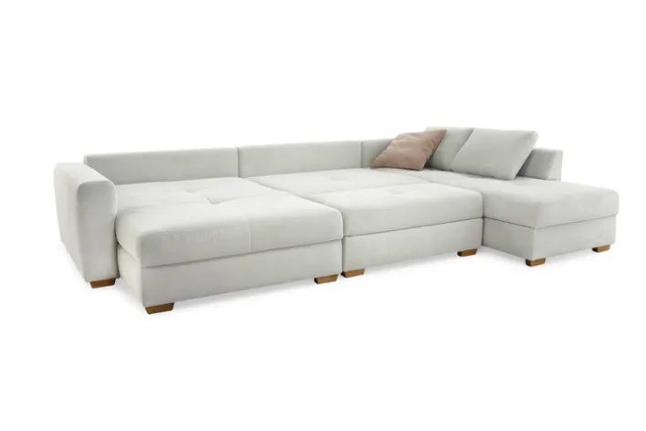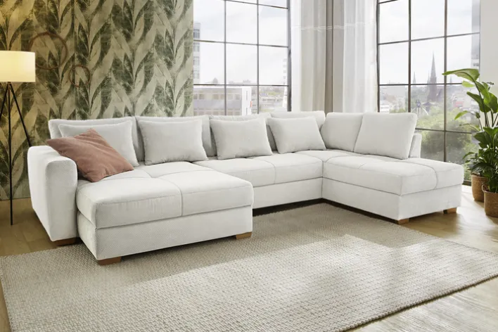 Diese großzügige EVEN Wohnlandschaft aus hellbeigem Waffelcord sorgt für gemütliche Stunden – auch mit der ganzen Familie oder mit Freunden. Ein besonderes Highlight der cleveren Konstruktion ist der Umstand, dass die Wohnlandschaft von Quartier einmalig beidseitig montierbar ist. So fügt sie sich noch besser in Wohnräume ein.