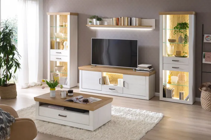 Das Set besteht aus zwei Schränken, einem Wandboard und einem TV-Lowboard. Jeder Schrank hat eine Breite von 71 cm, eine Höhe von 205 cm und eine Tiefe von 40 cm. Das Wandboard misst 181 cm in der Breite, 24 cm in der Höhe und 22 cm in der Tiefe. Das TV-Lowboard bietet mit einer Breite von 181 cm, einer Höhe von 62 cm und einer Tiefe von 50 cm ausreichend Platz für moderne Unterhaltungselektronik. Die klaren Linien und die dezente Beleuchtung der Glasböden setzen dekorative Akzente und bieten gleichzeitig praktische Ablageflächen.