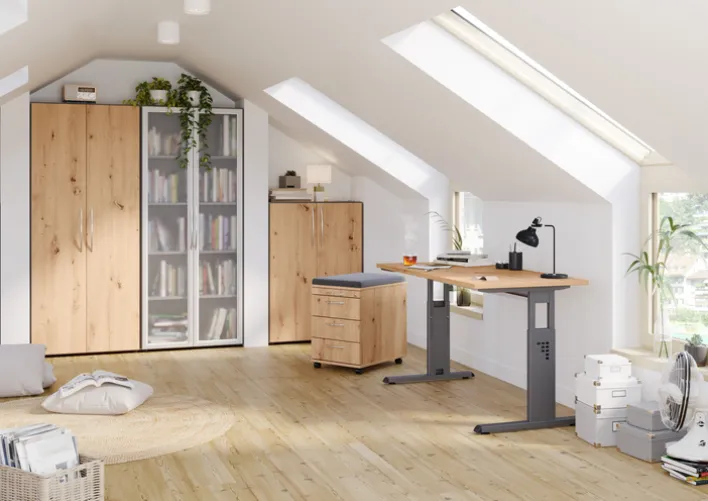 Seine technische Funktion der Büroablage ist dem Aktenschrank 80 x 114,4 cm Graphit/ Ahorn nicht anzusehen. Er dient auf einer Tiefe von 34,6 cm hinter zwei Drehtüren mit gewölbten Griffleisten als Stauraum für alle Gegenstände bis zur Höhe eines Aktenordners.