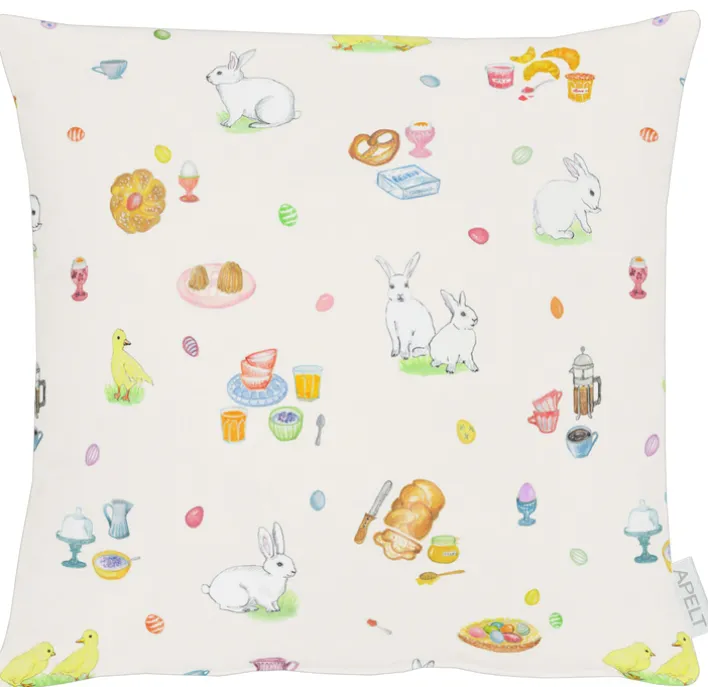 Die mehrfarbig bedruckte Kissenhülle HÄSCHEN & FRÜHSTÜCKSD. ALL-OVER von APELT verspricht Komfort und Osterstimmung. Sie ist quadratisch und 40 x 40 cm groß. Der Aufdruck zeigt Häschen, Enten, Ostereier und liebevolle Details in schönen Farben.