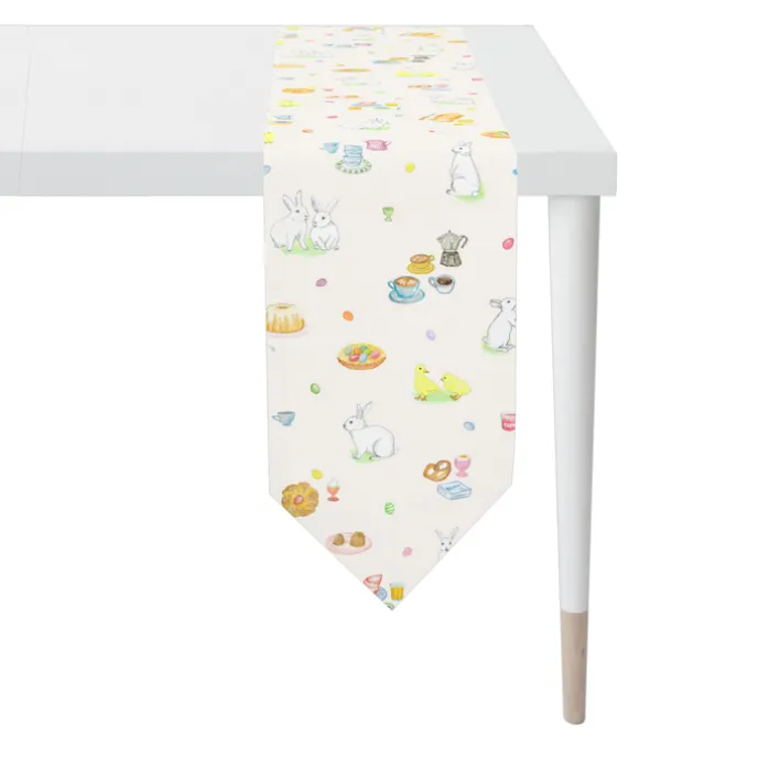 Das APELT Tischband mit HÄSCHEN & FRÜHSTÜCKSD. ALL-OVER ist 25 cm breit und 175cm lang. Es ist mehrfarbig bedruckt und aus Mischgewebe.