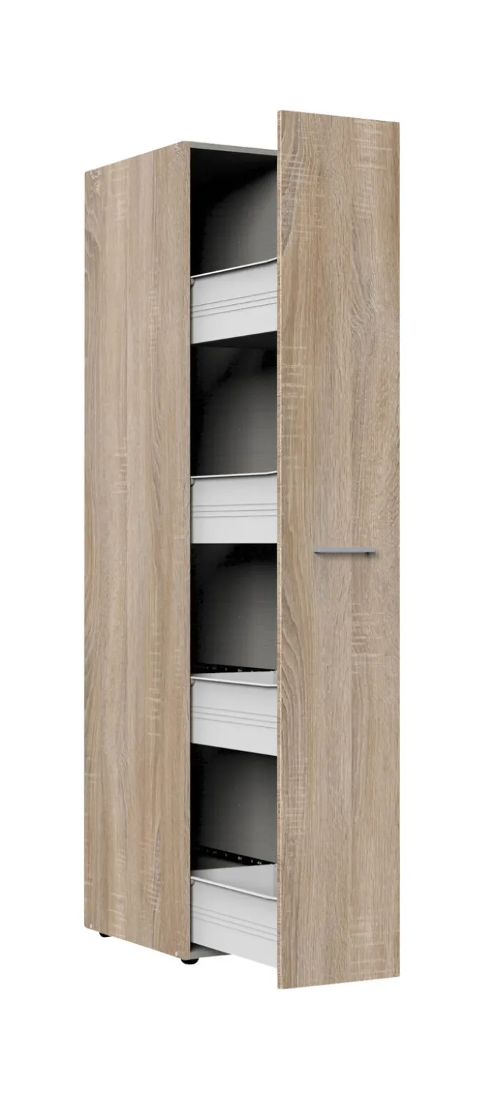 Der Apothekerschrank ist aus Holznachbildung in der Farbe Eiche Sägerau gearbeitet. Mit den Maßen 30 x 185 x 54 cm birgt er übersichtlichen Platz für Lebensmittel.