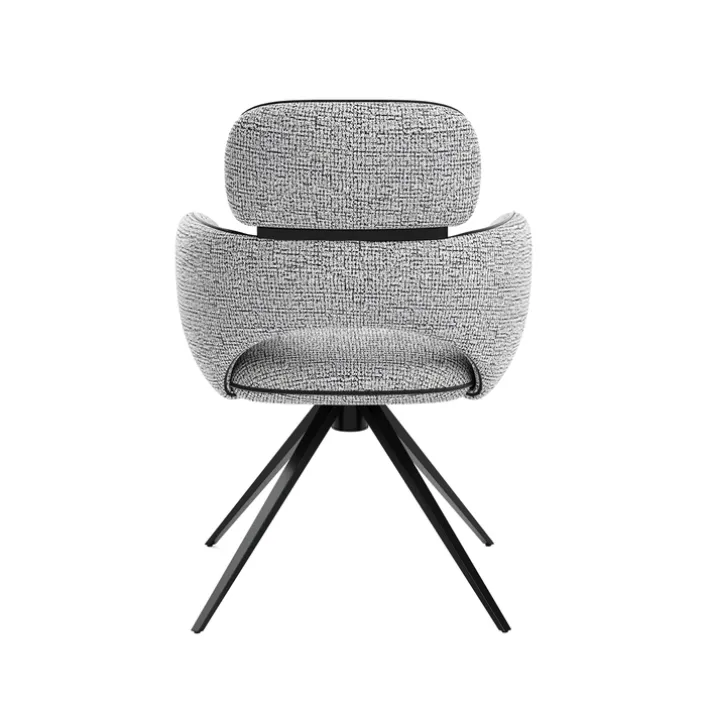 Das Design des Stuhls zeichnet sich durch ein festes, nicht verstellbares Armteil aus, das zusätzlichen Komfort bietet. Das Vierfußgestell aus Metall sorgt für Stabilität und unterstreicht den modernen Stil des Möbelstücks. Der Stoffbezug zeigt ein feines Muster, das dem Stuhl eine besondere Textur verleiht und ihn zu einem Blickfang in jedem Raum macht. Ideal für den Einsatz in Esszimmern oder Büros, passt dieser Stuhl perfekt in eine Vielzahl von Einrichtungsstilen.