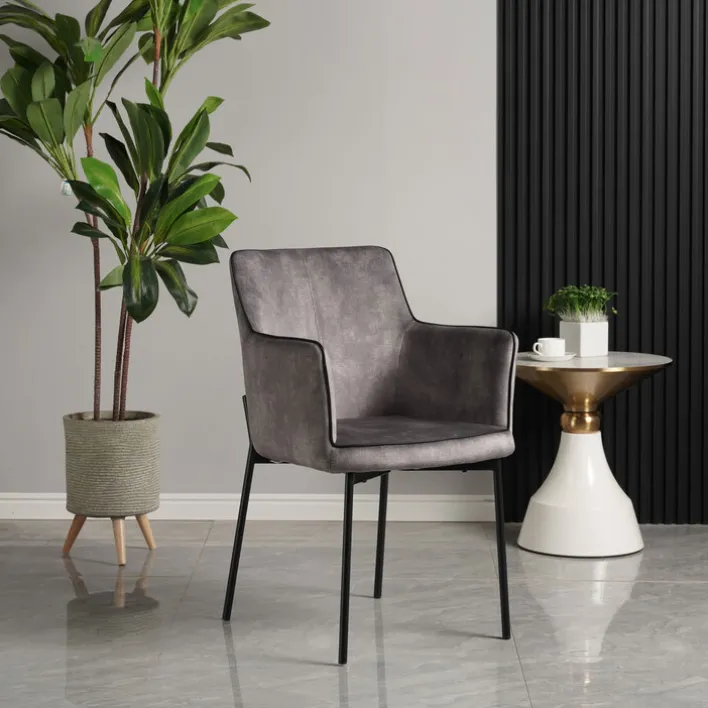 Der gemütliche Armlehnstuhl ist mit einem robustem Vierfußgestell aus schwarzem Metall gestaltet, das sowohl pulverbeschichtet als auch geschliffen ist. Der Bezug der Sitzfläche, der Rückenlehne und der Armlehnen besteht aus strapazierfähigem Polyester. Dieses robuste Synthetikmaterial ist leicht zu pflegen. Die Sitzfläche ist mit einer Breite von 57 Zentimetern und einer Tiefe von 60 Zentimetern bei einer Höhe von 48 Zentimetern sehr bequem.