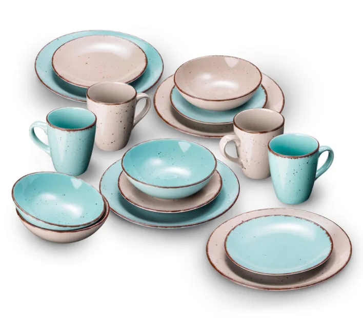 Das Kombiservice ist aus hochwertigem Feinsteinzeug mit viel Liebe zum Detail hergestellt und wird von Sternekoch Thomas Wohlfarter empfohlen. Ein trendiges Design in den Farben Türkis und Beige setzt natürliche Akzente auf Ihrem Tisch. Jedes ARTE VIVA Geschirrteil ist sorgfältig handgemalt und daher ein Unikat. Das robuste Geschirr ist spülmaschinen- und mikrowellengeeignet und bestens für eine alltägliche Verwendung geeignet. Das Kombiservice besteht aus vier großen Kaffeebechern, vier Desserttellern, vier Speisetellern und vier Schalen. Damit sind Sie für ein Frühstück mit Müsli oder Obstsalat sowie für Hauptgerichte mit Salaten oder anderen Beilagen ideal ausgestattet.