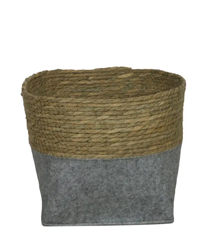 Die spannende Kombination aus robustem Filz, Synthetikfasern und Naturmaterialien wie Blättern, Blüten und Gräsern macht den Korb zu einem Blickfang in jedem Raum. Die feine Seiloptik des oberen Teils des Aufbewahrungskorbs passt harmonisch zum grauen Filz im unteren Bereich und am Boden. In dem Korb haben Zeitungen, Bücher, Pantoffeln sowie Schals und Handschuhe Platz. Das zweifarbige Modell hilft in jedem Raum, Ordnung zu halten.
