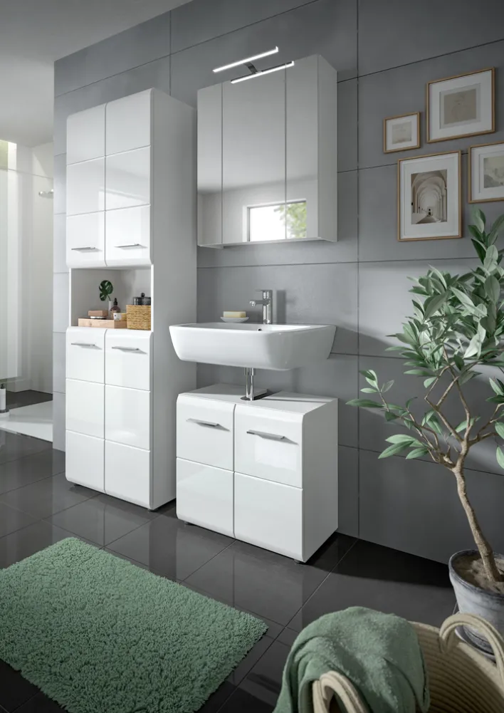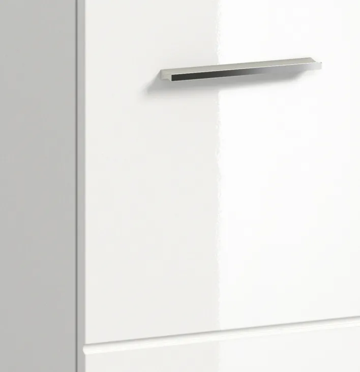 Ein Klassiker für das Badezimmer: der weiße Bad-Hochschrank LOGAN. Er sorgt für reichlich Ablagefläche und Stauraum. Geräumige Schränke wie der Bad-Hochschrank LOGAN sind ein Muss für jedes Badezimmer. Handtücher, Kosmetika, Fön oder Rasierer wollen griffbereit verstaut sein. Für kleine Bäder eignet er sich hervorragend. Denn durch seine Höhe benötigt er wenig Grundfläche für seine zahlreichen Aufbewahrungsoptionen. Vier Türen, vier Einlegeböden und insgesamt sechs Fächer sorgen für Flexibilität. So ist es ganz einfach, jederzeit Ordnung im Bad zu halten. Der Hochschrank ist aus Holznachbildung gefertigt. Mit seinen weißen Hochglanz-Oberflächen und silberfarbigen Kunststoffgriffen passt er sowohl in traditionelle wie modern eingerichtete Badezimmer.