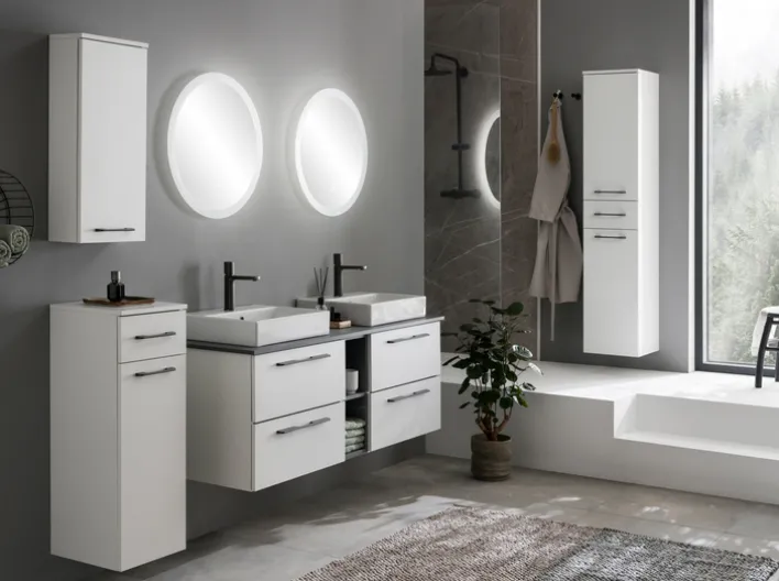 Der Schrank besteht aus einer Holznachbildung, die robust und pflegeleicht ist. Die Griffe sind in einem dunklen Ton gehalten, was einen dezenten Kontrast zur weißen Oberfläche bildet. Dieses Möbelstück ist ideal für alle, die Funktionalität und modernes Design in ihrem Badezimmer vereinen möchten.