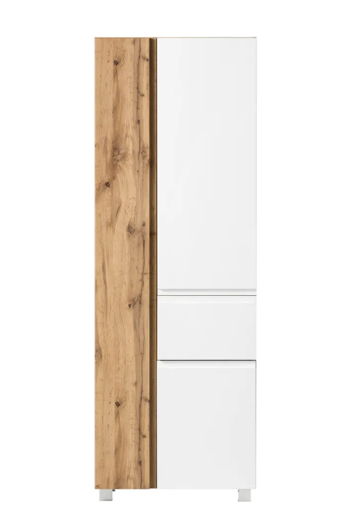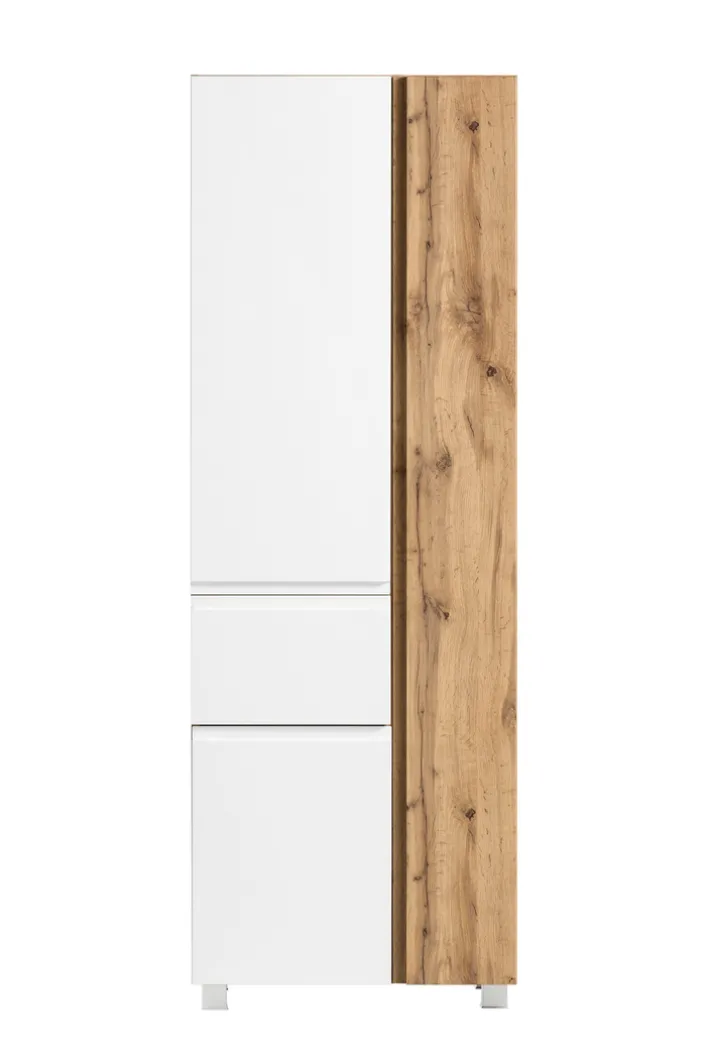 Die zwei asymmetrischen Türen lassen es vermuten: Der Bad-Hochschrank GENT bietet Aufbewahrungsfächer in verschiedener Breite. Mit acht Einlegeböden lässt sich die Höhe der Fächer variieren. Das ist ideal, um das den Stauraum zu optimieren und besonders viel unterzubringen. Gleichzeitig geben die Türen mit unterschiedlicher Breite dem Hochschrank einen modernen Look. Zu diesem Stil passt die Farbgebung in Wotaneiche-Nachbildung und Oxidbeton-Grau. Der Hochschrank lässt sich wahlweise an der Wand montieren oder auf die vier silberfarbigen Kunststofffüße stellen.