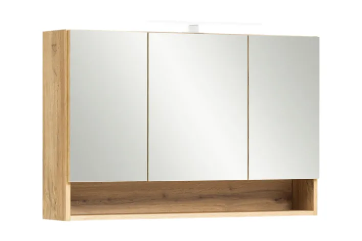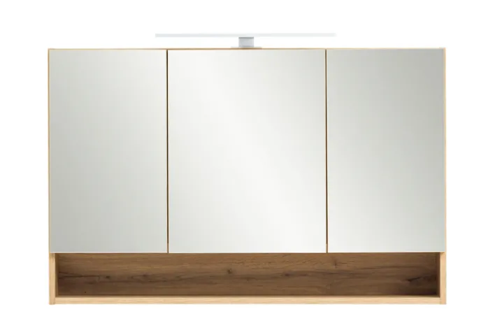 ANTWERPEN ist ein brauner, 100 cm breiter Spiegelschrank mit LED-Aufbauleuchte, der durch ein sehr elegantes und modernes Design auffällt. Besonderes Highlight ist die Nische mit Beleuchtung.