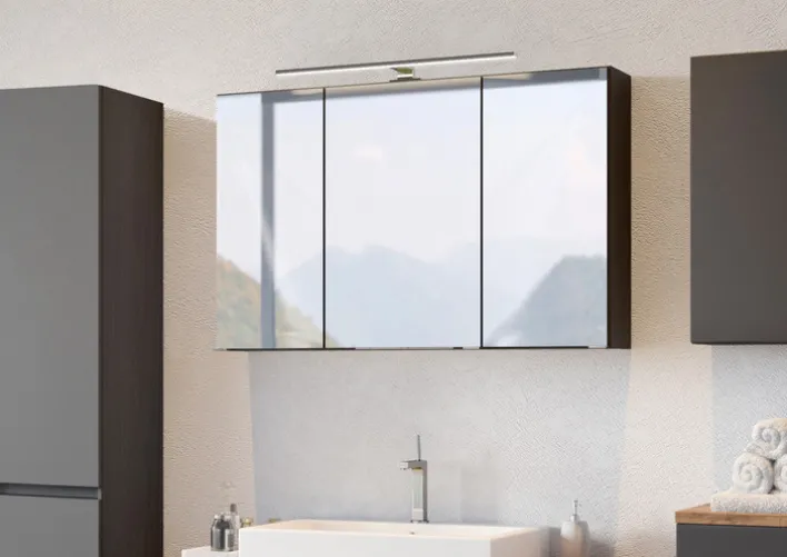 Der graue Bad-Spiegelschrank BREGENZ macht der Unordnung im Badezimmer endlich ein Ende, denn mit einer Breite von 100 cm und einer Höhe von 64 cm bietet er viel Stauraum. Geliefert wird er inklusive einer LED-Aufbauleuchte in Schwarz.