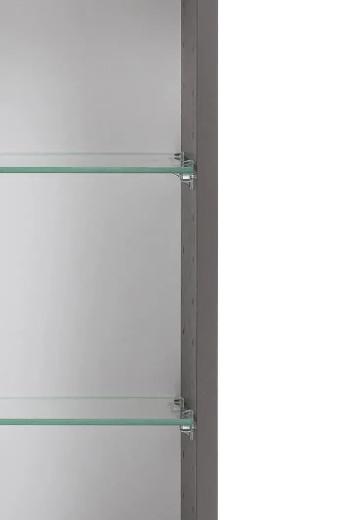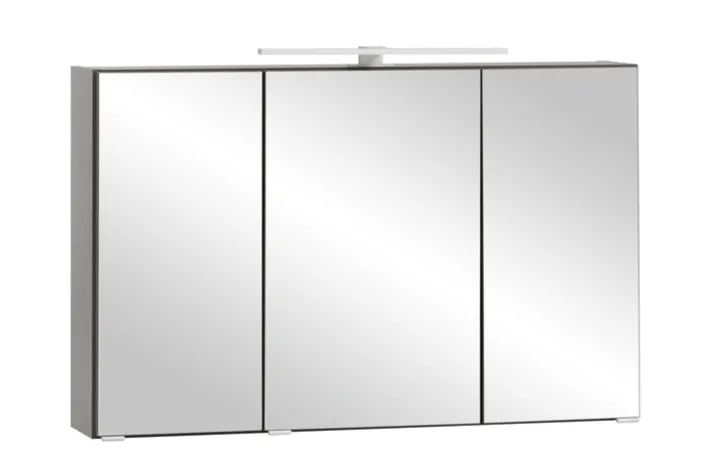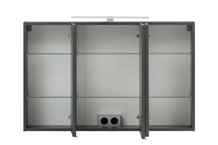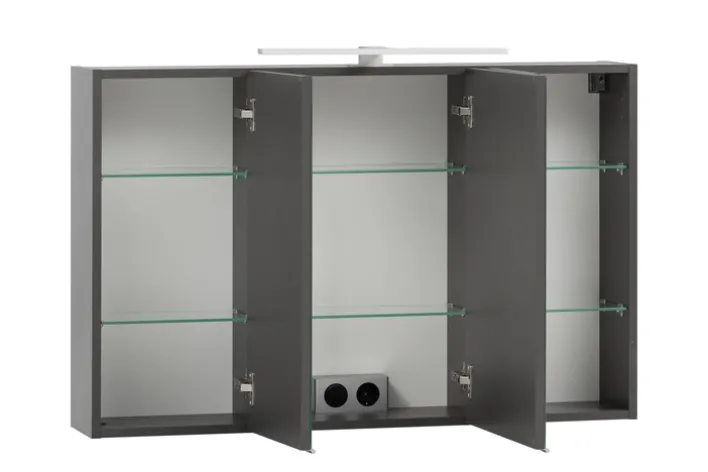 Der Bad-Spiegelschrank BRÜGGE grau 100 cm kommt mit graphitfarbenem Korpus und drei Spiegeltüren, sowie Glaseinlegeböden und integrierter LED-Beleuchtung. Mit seiner Höhe von 64 cm und der Tiefe von 20 cm entspricht er den Standardmaßen und eignet sich für die Montage über allen Einzelwaschbecken.