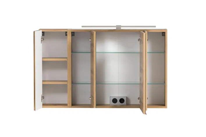 Der Bad-Spiegelschrank GENT hat eine Größe von 105 x 64 x 20 cm. Er besteht aus solider Holznachbildung und bietet zusätzlich zu den drei Spiegeltüren mit 3D-Effekt weiteren Stauraum. Hinter den Spiegeltüren befinden sich nicht nur sechs Glaseinlegeböden auf denen Beauty- und Pflegeprodukten Platz finden, sondern auch eine Doppelsteckdose. Der linke Schrankteil ist mit zwei Einlegeböden aus MDF ausgestattet. Für das perfekte Licht sorgt eine LED-Aufbauleuchte in Edelstahloptik.