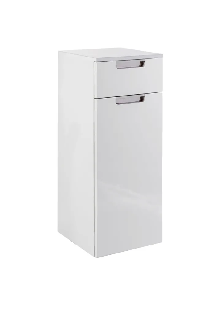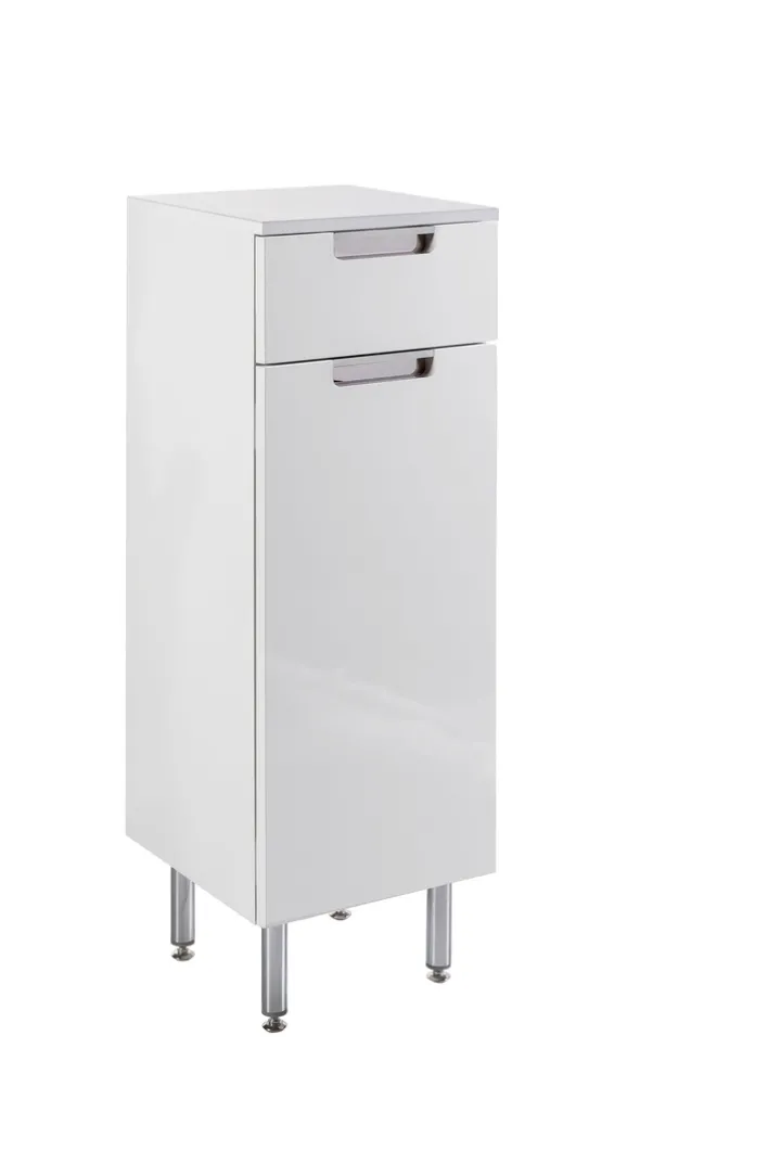 Der abgebildete Unterschrank für das Bad präsentiert sich in einem modernen, minimalistischen Design. Die Hauptfarbe ist ein elegantes Weiß, das sich nahtlos in verschiedene Badezimmerstile einfügt. Der Schrank besteht aus einer hochwertigen Holznachbildung, die Langlebigkeit und eine pflegeleichte Oberfläche bietet. Mit einer Breite von 33 cm, einer Höhe von 88,5 cm und einer Tiefe von 35 cm ist er kompakt und dennoch geräumig genug, um Stauraum für diverse Badutensilien zu bieten.